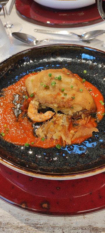 - croustillant de gambas sur lit de coulis tomates/poivrons