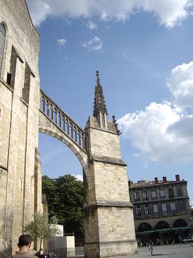 SUR LA MEME PLACE SE TROUVE LA CATHEDRALE SAINT ANDRE DE BORDEAUX COMMENCEE AU XI SURLES RUINES D UN ANCIEN EDIFICE DE CULTE, CONSACREE PAR URBAIN II - QUI A SUBIT DE NOMBREUSES MODIFICATIONS - LA NEF EST DU XIII EME SIECLE ELLE EST ENTOUREE DE 7 CHAPELLES RICHEMENT DECOREES DE MARBRE ET D ALBATRE - ELLE A DE MAGNIFIQUES VITRAUX UNIQUEMENT AUTOUR DU CHOEUR ET DES CHAPELLES - EN 1787 ELLE EST EN PARTIE DETRUITE PAR UN INCENDIE ET EST RESTAUREE EN 1804 - VOICI LE PORTAIL ROYAL DU XIII EME SIECLE BORDEE DE SCULTURES REPRESENTANT LES APOTRES ET LE JUGEMENT DERNIER