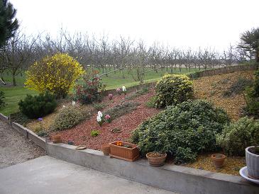 je voulais partager avec vous cette belle photo de mon parterre de fleurs bien fleuri avec ses touches de jacinthe, l anémone survivante, le photinia et les belles feuilles rouges et le forsytia qui arrive en éclosion toute jaune
