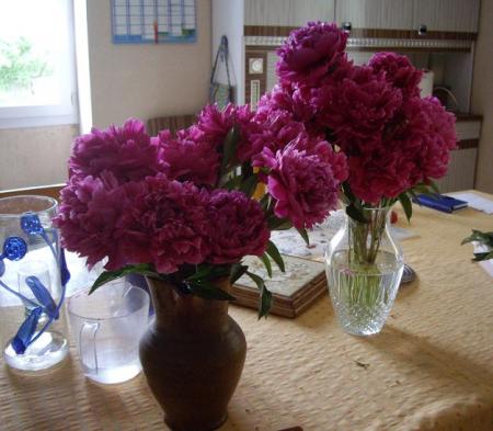 un peu plus maussade que les autres jours, je vous offre ces bouquets de pivoines que j ai été obligée de cueillir car elles ont fleuries toutes en même temps, et la pluie les a enlourdies et elles trainaient sur la pelouse donc elles sont mieux dans ma maison -