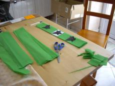 pour le mariage ma fille a prévu une décoration "nature" donc il faut confectionner un toit de feuille pour que les convives aient l impression de manger sous les arbres - voici donc la préparation dans du papier crépon, il faut découper les feuilles qui seront ensuite suspendues avec du rafia - et il faut que la salle en soit recouverte