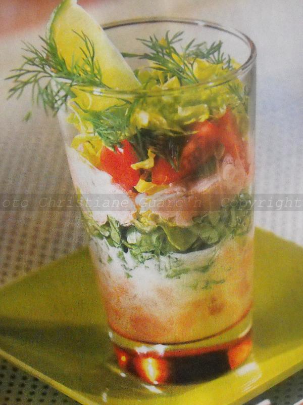 Verser une couche de saumon mariné au fond des verrines. Poser dessus une couche de salade ciselée. Ajouter une autre couche de saumon. Terminer par une chiffonnade de salade . Garnir de tomates cerise coupées en deux, d’aneth et d’oignons finement émincés.