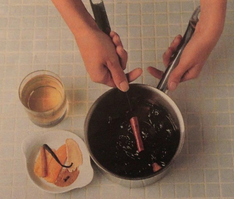 Mélangez les pruneaux avec 20 g de sucre, les zestes, la cannelle, le clou de girofle , le gingembre, la vanille, fendue et le cumin. Recouvrez avec le vin de madiran à niveau. Cuire 25 minutes à feu doux. Laissez refroidir. (on peut aussi faire cette macération la veille, les pruneaux sont alors plus parfumés)