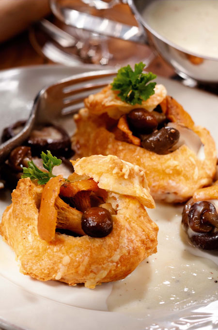 Ouvrir les gougères sur le haut, déposer à l'intérieur des champigons sautés. Présenter la sauce à part.
