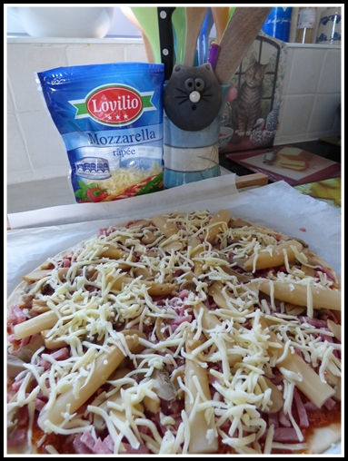 J'aime bien mettre de la mozzarella sur ma pizza. D'habitude, j'achète un sachet de mozarella "di buffala" mais cette fois-ci, autre découverte : la mozzarella râpée. J'ai trouvé cela bien pratique aussi.