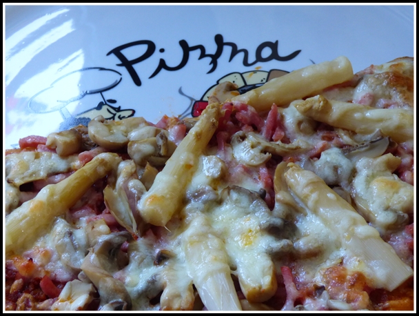Comme ingrédients pour préparer ma pizza : des allumettes de jambon, des petites asperges et des champignons de Paris. Le tout parsemé de la nouvelle mozzarella râpée.