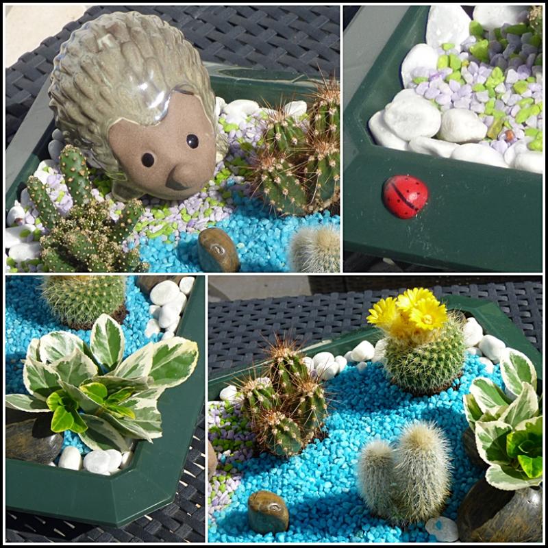A présent, les fleurs sont fanées et comment réutiliser le contenant en plastique vert, les blocs de mousse et les petits cailloux verts et roses? Et bien comme ça..... J'avais des cailloux bleus. Roger a retrouvé des petits galets dans son atelier bricolage. J'ai acheté quelques cactus et me suis amusée ce matin à faire cette compo qui a trouvé sa place dehors sur la table de mon petit salon de jardin.