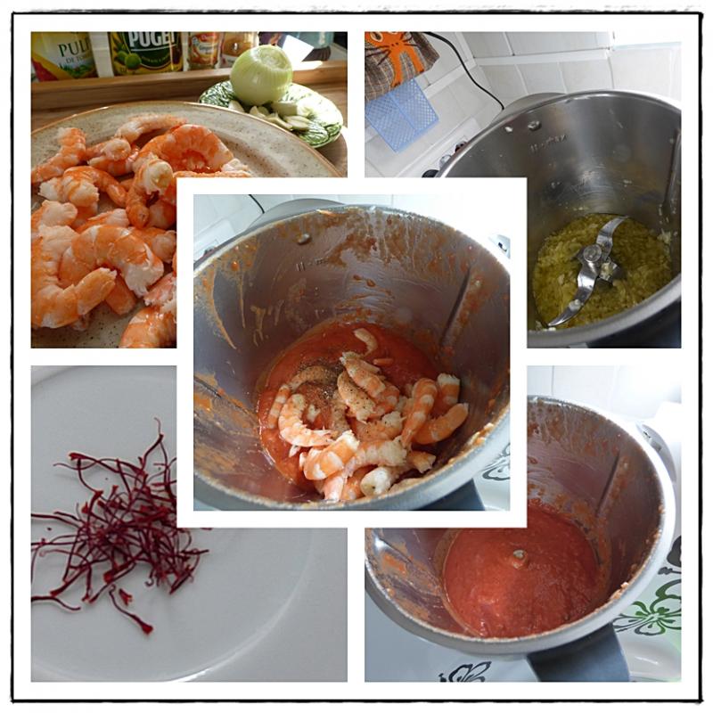 1 - Décortiquer les crevettes. 2 - Mettre les gousses d'ail, l'oignon coupé en deux, le piment d'Espelette et le gingembre dans le bol. Mixer 5 secondes à vitesse 8. 3 - Ajouter l'huile d'olive et régler 5 minutes, 100°, vitesse 1. 4 - Ajouter le safran et la petite boîte de tomates pelées et mixer 5 secondes, vitesse 10. 5 - Ajouter les crevettes décortiquées, saler et poivrer. Régler 10 minutes, 100°, fonction sens inverse, vitesse 1.