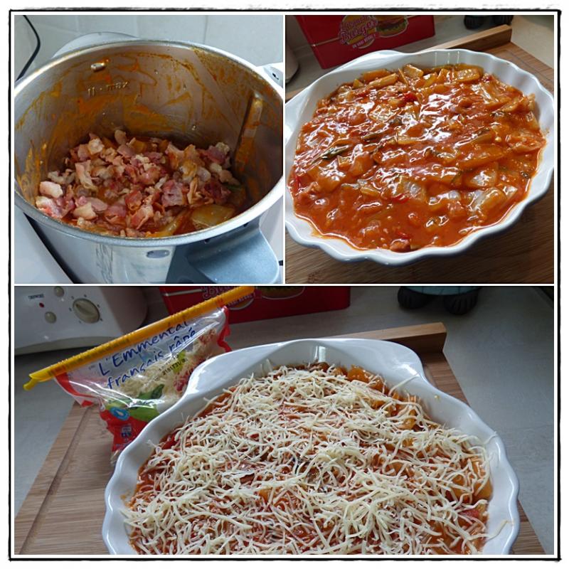 4 - Dans le bol, mettre l'ail et les échalotes. Mixer 5 secondes, vitesse 5. Ajouter l'huile d'olive et programmer 3 minutes, Varoma, vitesse 1. 5 - A la sonnerie, ajouter les tomates coupées, le vin blanc et les herbes de Provence. Programmer 10 minutes, Varoma, vitesse 3. 6 - Pendant la cuisson, préchauffer le four à 180° et faire revenir la poitrine fumée coupée en morceaux (ou les lardons) dans une casserole.