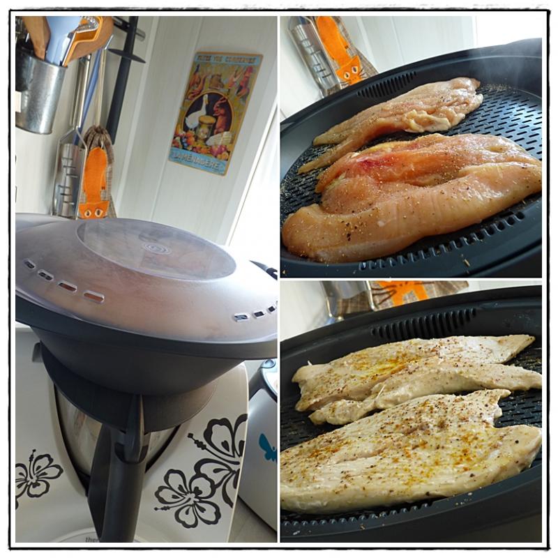 1 - Déposer les blancs de poulet sur le plateau du varoma. Saler et poivrer et assaisonner avec un peu de curry.