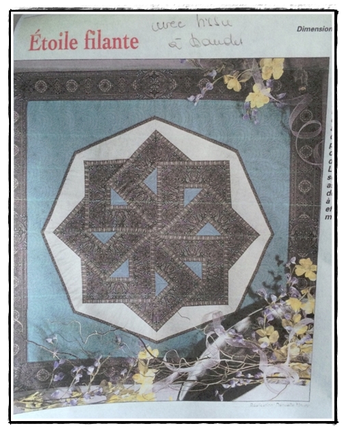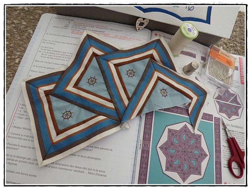 J'ai fait des tests cet après-midi pour déterminer les dimensions de l'ouvrage fini. L'étoile filante sera posée en appliqué sur le tissu bleu marin. On ne verra plus le bord blanc qui sera utilisé pour le rentré.