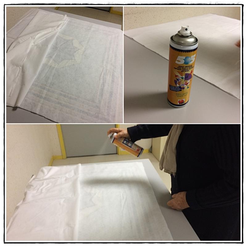 Puis, on vaporise sur le molleton de la colle 505 à une distance de 25 à 30 centimètres. Cette colle temporaire permet un maintien précis et facilite le matellasge sans faire de plis.