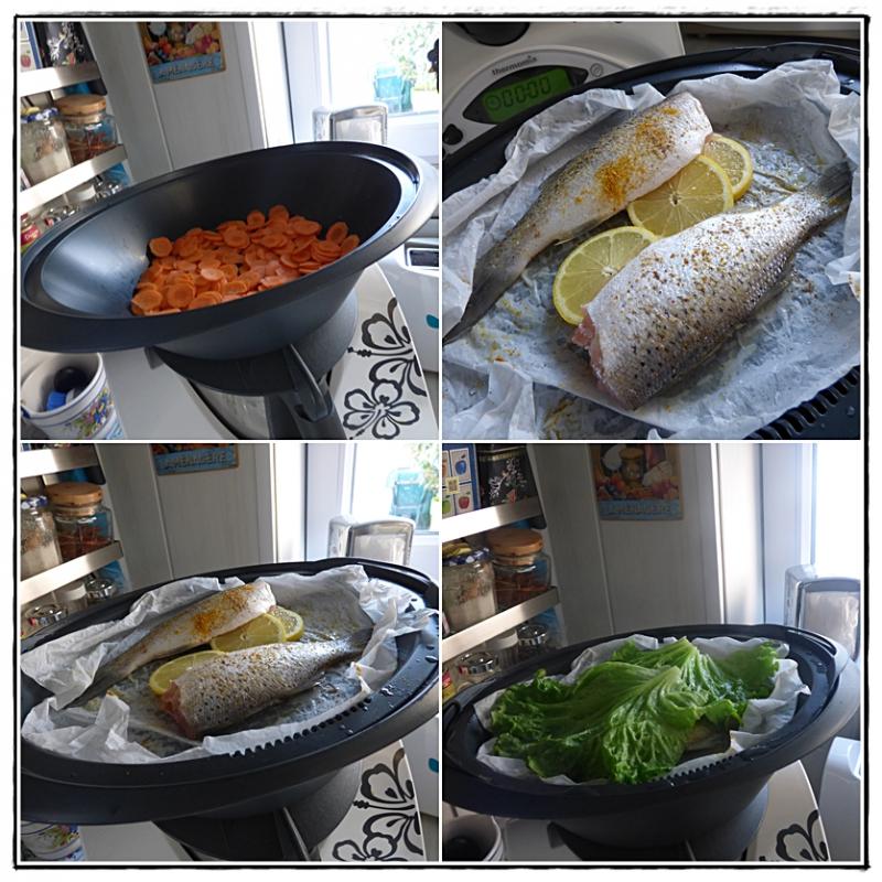 2 - Chiffonner un morceau de papier sulfurisé et le poser sur le plateau du Varoma. Disposer le poisson sur le papier sulfurisé. Saler et poivrer et le saupoudrer d'un peu de curry. Disposer quelques rondelles de citron.