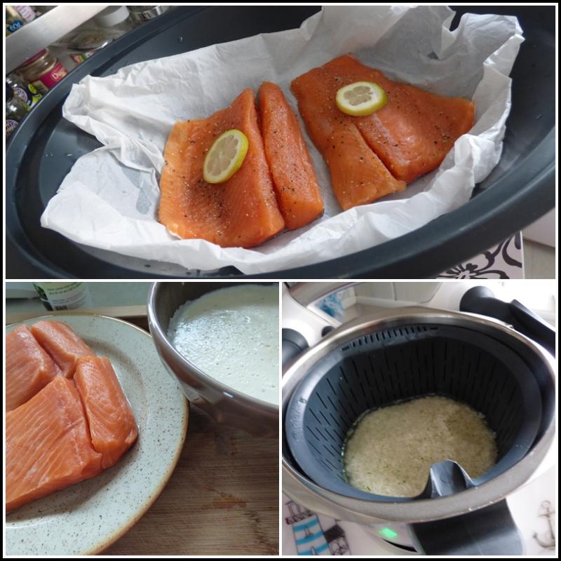 J'ai sorti un filet de truite que j'avais au congélateur. Je l'ai placé dans le Varoma du Thermomix et j'ai mis du riz dans le panier de cuisson. J'ai fait cuire le tout 15 minutes, Varoma, vitesse 1. Le temps dépend aussi du type de riz utilisé. Pour la cuisson du riz au Thermomix, reportez-vous à cet article.