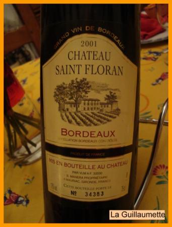 Nos impressions : Voilà une recette qui sort de l'ordinaire et qui est à la fois surprenante par son goût raffiné et par sa facilité de réalisation. Victor, mon gendre, qui n'apprécie pas trop "le sucré-salé" a été séduit. Le goût de pain d'épices n'est pas prédominant. C'est vraiment un régal! Mes suggestions : Vous pouvez aussi remplacer le cidre par de la bière. Si, en fin de cuisson, vous trouvez qu'il y a trop de sauce pour accompagner ce plat, vous pouvez augmenter le feu pour faire réduire. Mais attention! surveillez bien pour éviter que ça ne colle. Pour accompagner ce plat, Roger a choisi un Bordeaux millésimé : un Château Saint-Floran 2001.