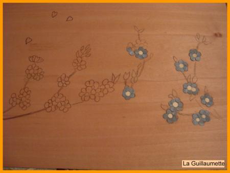 Lundi 30 mars 2009 Après plusieurs semaines d'absence suite à notre séjour à Meschers et d'autres petits imprévus, nous reprenons l'activité marquéterie ce lundi! A cette séance, j'ai avancé dans le feuillage et les tiges. C'est assez long car il faut découper au cutter des morceaux très fins pour réaliser les branches. ========================================= Je vais penser maintenant au montage dans le plateau. Mais avant, je vais peindre les bords du plateau.