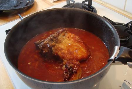 Vous pouvez l'accomoder de pâtes ou de riz. C'est une autre façon de cuisiner la côte de porc! Les ingrédients pour 4 personnes : - 4 côtes de porc - 1 oignon haché - 1 gousse d'ail - 1 grande boîte de concentré de tomates - 1 bouillon « Epices » - quelques pincées de "Secrets d'arômes" de Knorr - poivre La recette : 1 - Dans une cocotte, faire dorer les côtes, l’oignon haché et l'ail dans un peu d’huile. 3 - Pour rehausser le goût de mon plat, j'ai ajouté quelques pincées de "Secrets d'arômes" de chez Knorr (facultatif).