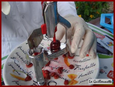 Quant à moi, j'ai enfilé les gants et je dénoyaute à la main. Ca va aussi mais attention aux projections de jus. J'ai enfilé un vieux tee-shirt de Roger pour éviter les tâches!