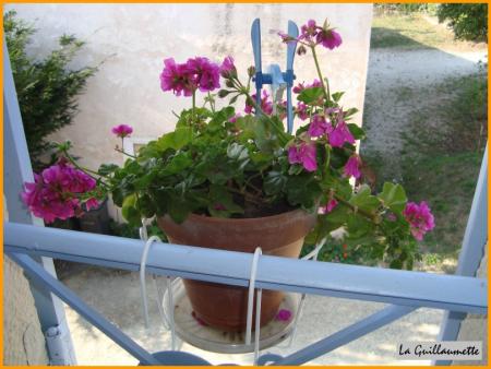 Cette année, nous avons bien réussi avec nos plantations. Quand je pense que ces plants viennent de Lorraine et ont voyagé dans notre valise..... Les géraniums lierre accrochés aux fenêtres de l'étage sont toujours en fleurs. Je leur donne régulièrement de l'engrais.