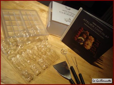Un coffret "Atelier du chocolat" pour faire ses chocolats soi-même comme un vrai artisan chocolatier grâce aux ustensiles fournis dans le coffret (une pince pour faire les orangettes, un triangle, une feuille guitare), un livre de recettes et des moules à petits sujets et à tablette de chocolat.