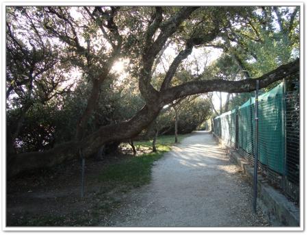 Puis on pénètre ensuite dans une allée de chênes verts courbés par les vents marins.
