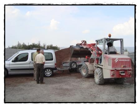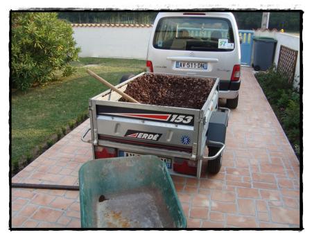 La remorque attelée à la voiture, nous voilà partis vendredi après-midi à la super jardinerie de Corme-Royal pour acheter de la pouzzolane. Notre voisin et ami, Jacques nous a accompagnés.