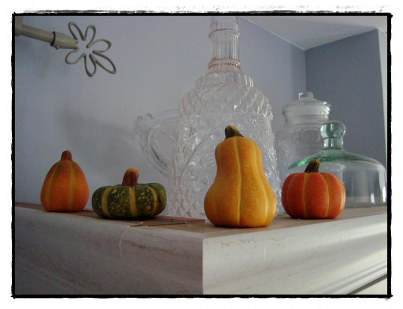 Voici ma première composition : une coupe posée sur la table du salon que j'ai garnie avec de la paille, les petits coloquintes, un hérisson. J'ai ajouté une pomme de pin de notre jardin, quelques noix et pour les gourmands, des trouspinettes offertes par Dely lors de notre rencontre. Il en reste encore quelques uns!!!