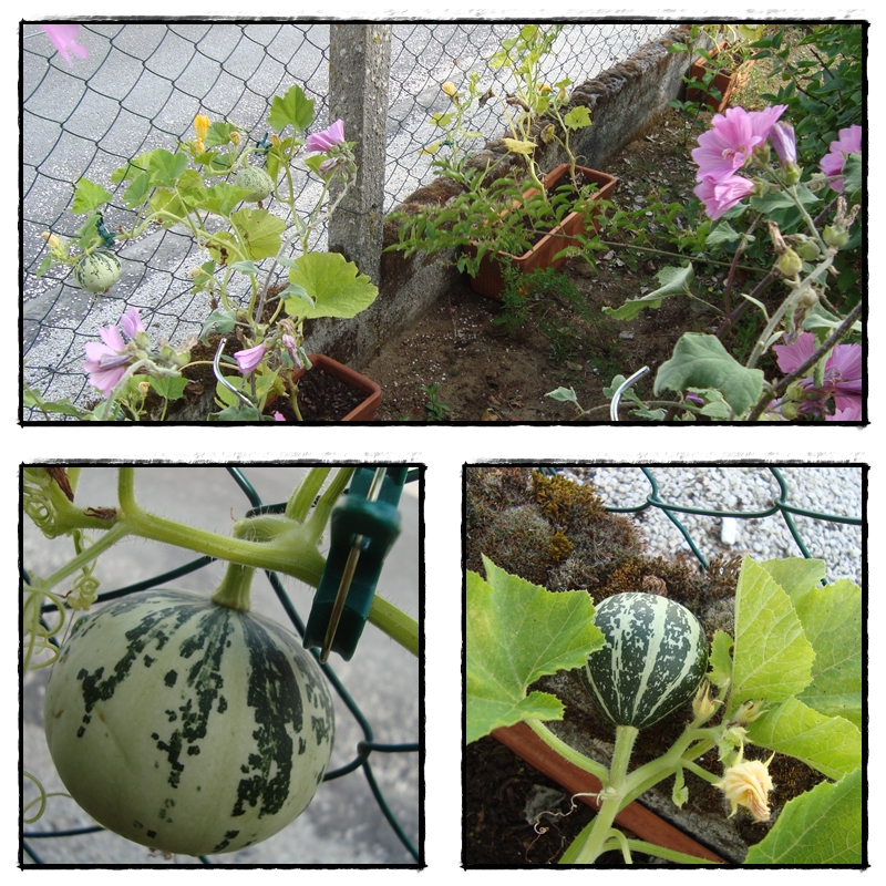 Roger avait semé des coloquintes dans des jardinières qu'il avait placées près du grillage de clôture. Ca poussait bien.... la preuve!