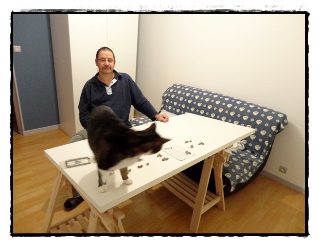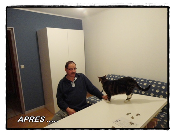 Mais avant de parler d'aménagement et de meubles, il faut repeindre et retapisser.... Et hop! c'est fait.... comme Roger travaille vite !!!! Deux murs sont tapissés avec du papier bleu et les deux autres avec du papier fibre de verre peint en blanc. Les plinthes, encadrement de porte et porte sont peints en gris clair. Ca change, non? Pirate en profite pour prendre possession des lieux refaits! Le canapé qui était dans la maison de Meschers, nous servira de lit d'appoint.