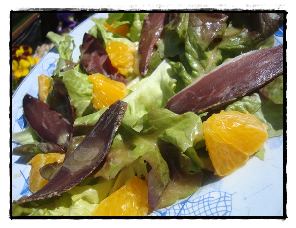 2 - Couper le magret séché en fines tranches. J'ai enlevé le gras.... Le disposer aussi sur l'assiette. 3 - Pour la vinaigrette, mélanger 2 mesures d'huile d'olive et 1 mesure de vinaigre de cidre. Ajouter le jus d'une demi-orange. Saler et poivrer. Suggestions : Vous pouvez ajouter un peu de sauce soja à la vinaigrette. Dans ce cas, ne pas saler. Vous pouvez aussi ajouter quelques croûtons et des tomates cerises à la salade.