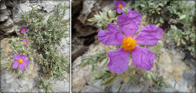 Nous laissons notre voiture au parking. De jolies fleurs de rocaille attirent mon attention. Les pétales ont l'aspect du papier crépon. Il me semble que ce sont des aubriètes...