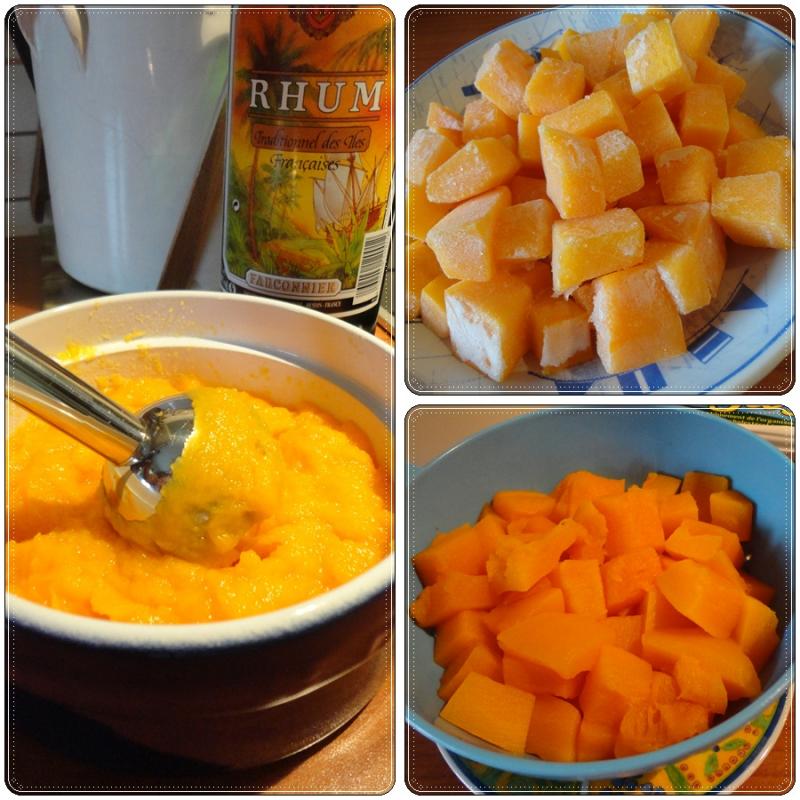 1 - Ôter l'écorce du potiron et enlever les pépins. Le couper en dés et le faire cuire au micro-ondes une dizaine de minutes. J'ai utilisé du potiron que j'avais congelé en dés.