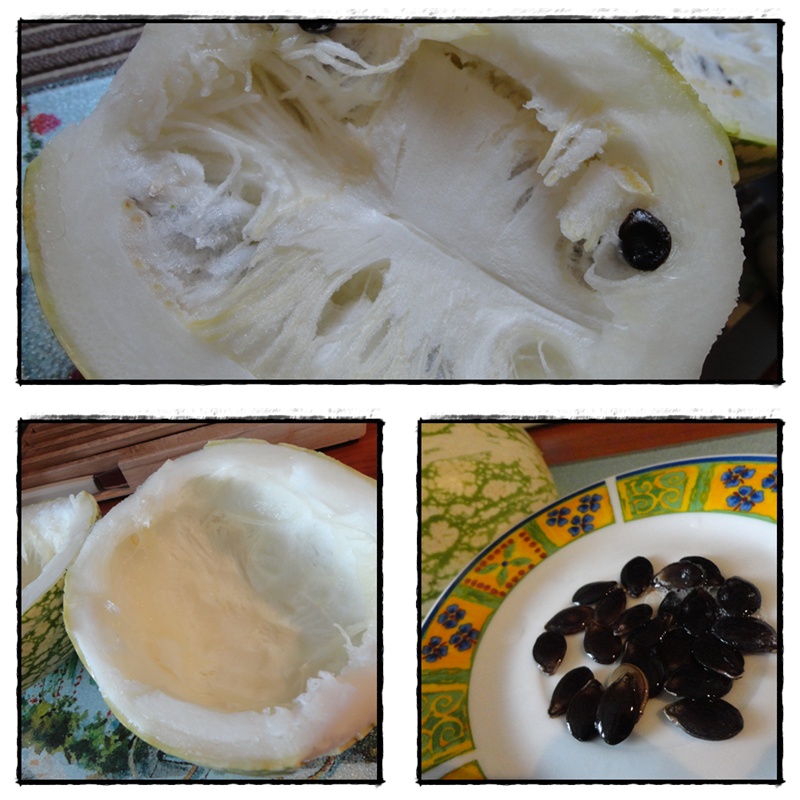 Elle a un épiderme très coriace et une chair blanche. Les graines sont noires, ce qui est très particulier. Elle ressemble beaucoup à la courge spaghetti que j'ai déjà cuisinée car sa chair devient filamenteuse et ressemble à des vermicelles à la cuisson.