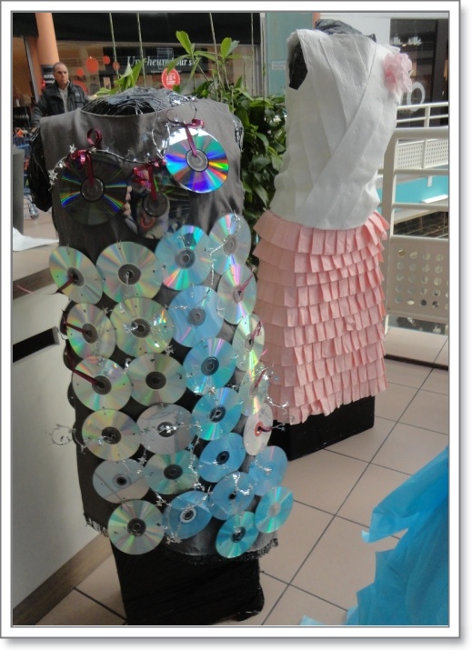 Deux personnes appartenant au personnel du Centre Leclerc exposent leurs créations : des robes confectionnées avec des objets ou produits du magasin.