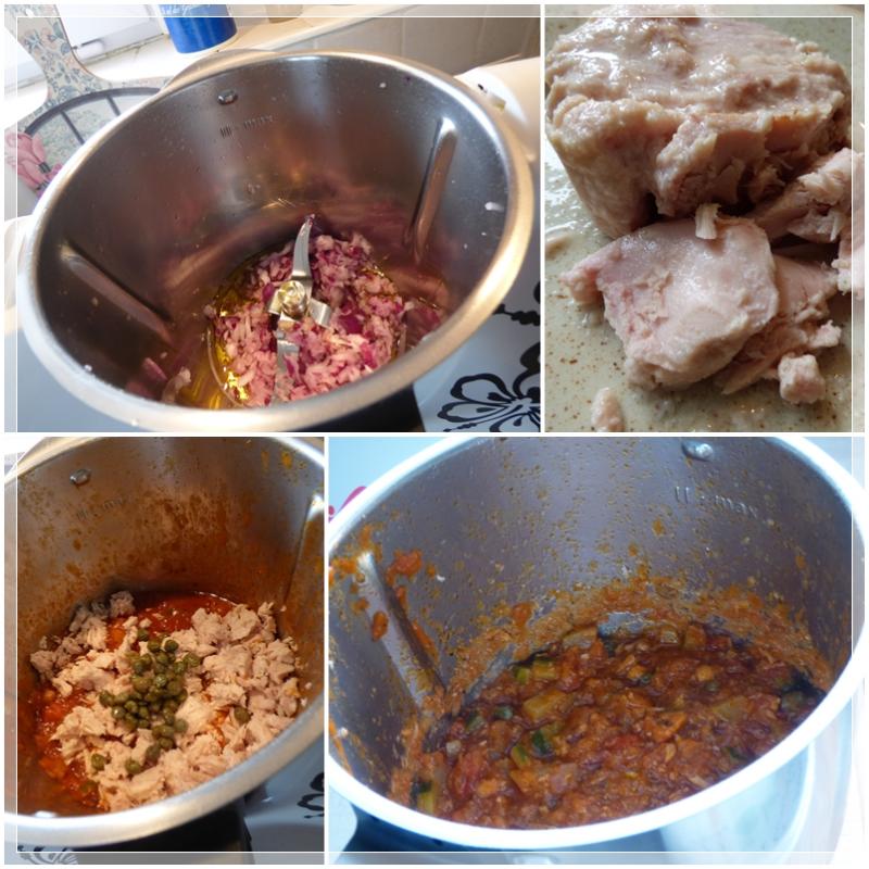 4 - A l'arrêt de la minuterie, ajouter le thon émietté et les câpres. Cuire 5 minutes, sens inverse, 100°, vitesse 1.