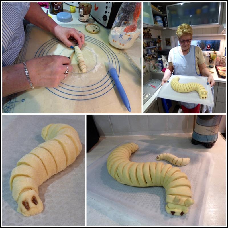 10 - En arrivant au niveau des lanières, les rabattre une à une sur le boudin garni. Pour plus de facilité, j'ai coupé les lanières toute à la même longueur et j'ai mis le restant de pâte de côté. 11 - Déposer 2 pépites de chocolat ou deux petits morceaux de raisins secs au bout de la brioche pour former les yeux. Avec les chutes de pâte, j'ai confectionné 2 antennes. Pour les faire tenir, j'ai utilisé un morceau de cure-dents que j'ai habillé avec la pâte.