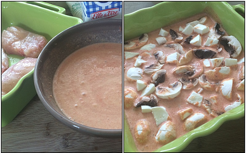 Les ingrédients : - 350g de blancs de poulet - un sachet de soupe "Velouté de tomates à la mozzarella" - 100ml de crème liquide - 200ml d'eau - 1 boule de mozzarella - des champignons de Paris frais La recette :