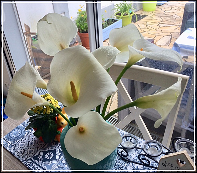 On raconte que ces petites clochettes blanches diffusent, en même temps que leur doux parfum, une onde de chance et de bonheur dans les demeures où elles sont installées. Alors, même pendant le confinement, je peux vous envoyer un brin de muguet virtuel ! Joyeux 1er mai! Comme cette année est particulière, je vous offre aussi ces arums de notre jardin.