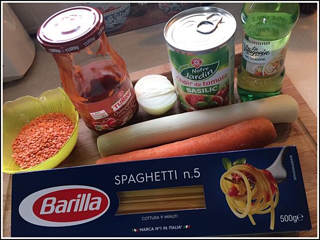 Les ingrédients : - 1 poireau - 1 oignon - 1 carotte - 1 boîte de tomates pelées. Pour moi, une boîte de dés de tomates au basilic - 1 verre de lentilles corail - 1 verre de vin blanc de cuisine - sel et poivre du moulin - 200g de spaghettis. La recette :