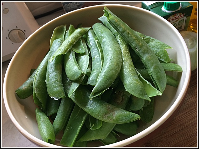 Les ingrédients : - des petits pois - des carottes - des navets - des pommes de terre - des tranches de poitrine fumée ou des dés de lardons - 1 oignon - sel et poivre du moulin - 150ml de vin blanc - 100ml d'eau J'ai gardé les cosses de petits pois car je m'en servirai pour préparer une soupe.