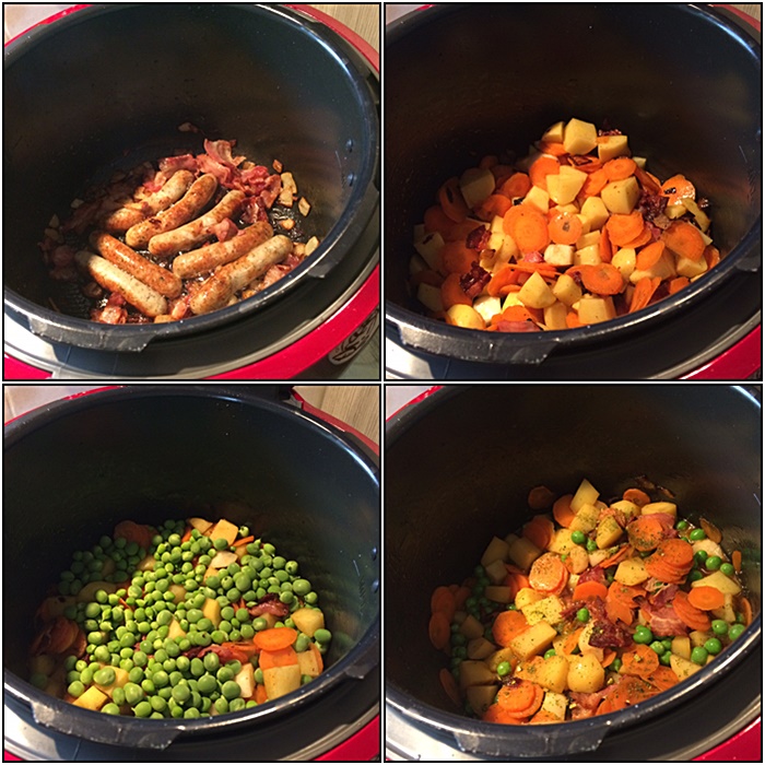 1 - Eplucher tous les légumes et programmer le Cookéo en mode "Dorer". Faire revenir l'oignon coupé et la poitrine fumée coupée en gros morceaux. Ajouter les petites saucisses. Lorsqu'elles sont bien dorées, les réserver.