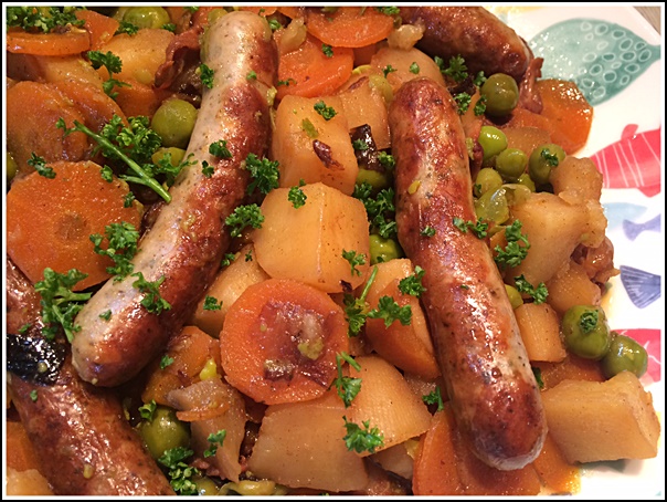 Fabriquée à partir de viande de porc grossièrement hachée, elle est assaisonnée de marjolaine, de sel, de poivre, de gingembre, de cardamome et de citron. J'ai trouvé ces saucisses chez Lidl. Pour les accompagner... Roger a acheté au marché pour la première fois de la saison, des petits pois frais et j'ai préparé une jardinière printanière avec des carottes, des pommes de terre et des navets.