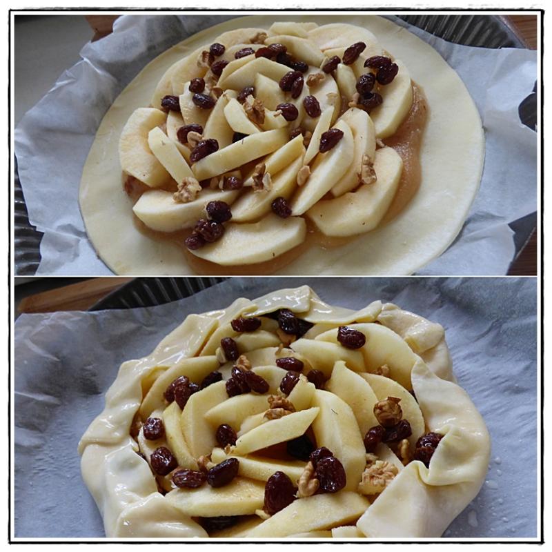 J'ai parsemé le dessus de la tarte de petits morceaux de noix et de raisins secs macérés dans du rhum. Et pour la première fois, j'ai replié les bords de la tarte pour en faire une tarte rustique. Mes copines blogueuses l'ont déjà fait et ça m'avait plu!