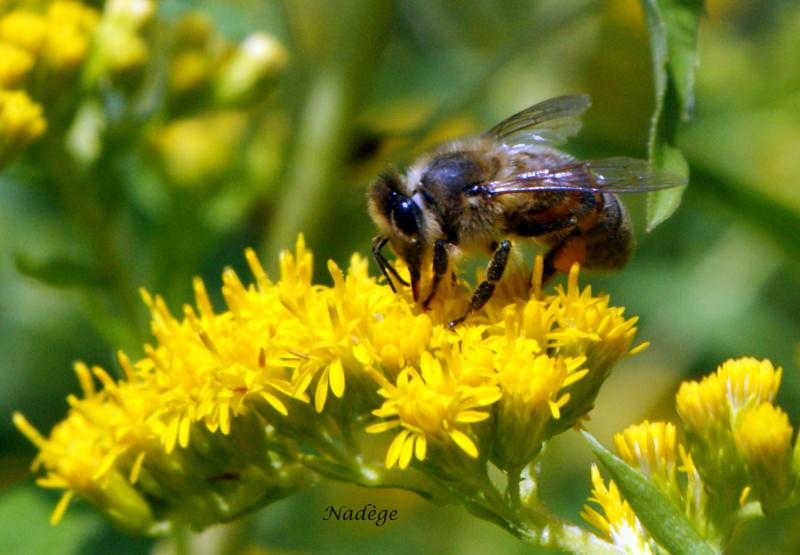 Nombreuses abeilles à miel ce matin en plein soleil sur mon massif de verges d' or .