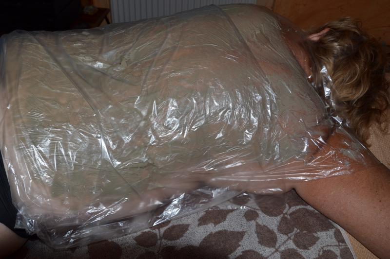 Une bonne séance massage de 2 heures et voilà mon Evelyne remise sur pied, et très contente du résultat, en plus pour moi des photos. Je pose ensuite une feuille plastique pour la sudation, ensuite une petite couverture chauffante et je l'a laisse pendant 30 mns.