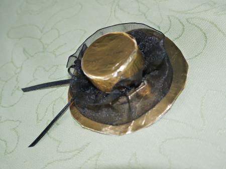 Toujours dans l'idée de faire un chapeau cowntry pour ma barbie et son cheval, j'ai fait un essai. Donc on part d'un bouchon en plastique qui se visse, de carton et de papier doré enveloppant du chocolat. j'ai donc fait un cercle avec le carton évidé au milieu pour pouvoir l'enfiler sur le bouchon à vis. Avec de la colle forte j'ai collé le papier doré autour du bouchon et sur le carton. Opération délicate afin de ne pas trop se mettre de colle sur les doigts Une amie m'avait donné des petits rubans qui se trouve sur certains de ses flacons de parfum. Pour finaliser mon chapeau j'ai enfilé ce petit ruban élastiqué. voila le résultat |