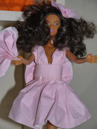 Tout ca pour vous dire qu'aujourd'hui j'ai eu idée de faire une tenue "éphemere" pour une poupee barbie, ben le papier toilette ? c'est on ne peut plus éphèmere non ? |