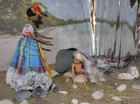 Doudou Pastel vient sur la plage tous les jours pour ramasser des coquillages, afin de gagner sa vie, le travail est pénible mais elle en perd pas sa bonne humeur, quand tout d'un coup, effrayée et levant les bras au ciel elle découvre Maelle sur son rocher, Maelle qui pour une fois s'est laissée surprendre !! hum étourdie Maelle ! |
