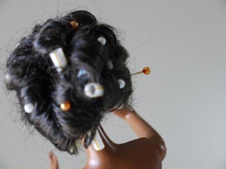 Aujourd'hui, coupure de courant prévue entre 8 h et 12h, j'avais oublié !!! du coup, oups, tout éteint a 9h mais ouf la fée electricité est réapparue à 11h, c'est fou le nombre de choses que l'on aurait à faire si l'électricté fonctionnait, repassage, aspirateur, cuisine, ordi aussi lol, du coup, quoi faire en attendant patiemment. J'ai entrepris le démelage des cheveux de la Miss Blacky. ALors, pré démelage avec un peigne à grandes dents, shampoing, application de l'apres shampoing spécial cheveux secs et abimés, continuer à démêler avec le produit, puis rincer. Enfin éponger sans emmeler le peu qu'on a réussi à démêler, et la le plus drole vraiment bien démêler pour pouvoir passer le peigne partout. Au passage, elle a bien perdu quelques cheveux mais globalement c'est "moins pire" que ce que je croyais. Préparation des cheveux avec les bigoudis et passage à l'acte de la permanente, car j'ai recherché cette poupée était avant coiffé à "lafro" mais j'aurais bien envie del ui faire des anglaises. En attendant de statuer sur sa future coiffure (surtout que je voulais la vetir d'un boubou) la voici à sécher apres sa permanente. |