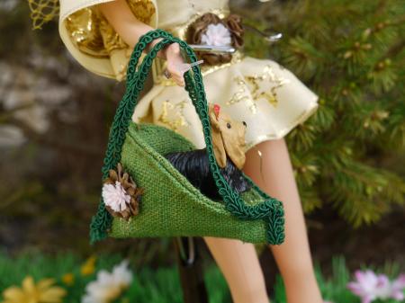 J'ai cherché un moment comment camoufler les cheveux trop courts derrière. L'idée d'un chapeau est arrivée puis du chapeau une tenue a suivi naturellement Dans le meme temps, lors de mes courses j'avais trouvé des oeufs genre kinder surprise mais avec des chiens annoncés en surprise, gourmande que je suis j'ai pris 2 boites de 3. Par curiosité j'ai ouvert tous les oeufs et j'ai monté 5 chiens laissant le 6eme à monter à mon homme car trop difficile pour moi. Pas de chihuahua dans les races acquises mais un Yorkshire. J'ai donc poursuivi la tenue de ma poupée avec la fabrication d'un sac pour chien de petite taille, j'ai passé quasiment tout l'apres midi sur cette confection. J'ai dessiné le patron, découpé le tissus (toujours celui donné par Fanette) j'ai récupéré la mousse d'une galette de chaise pour rembourer le "dodo" et j'ai retrouvé du galon pour les finitions. Et pourquoi avoir voulu faire ce sac ? Et bien je pense qu'en voyant la poupée vous penserez à la meme personne que moi. allez je vous aide pour la personne people